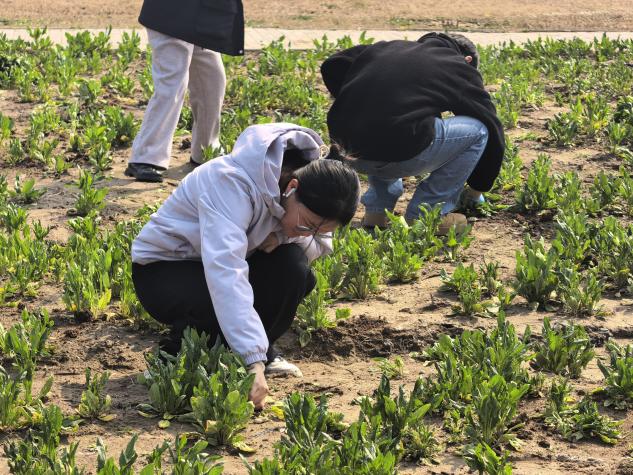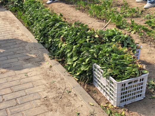 活动首阶段的核心任务是“收获”。同学们来到校园内指定的绿地区域,开展了一次特殊的劳动实践——收获成熟的菠菜。活动现场,大家分组协作,深入垄间,小心翼翼地用手握住菠菜的茎叶根部,将其从土壤中完整拔出,随后轻抖根须上的泥土,并将收获的菠菜整齐码放。