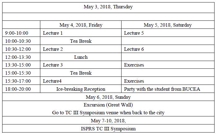 The summer school will be organized by the Technical Commission III (TC III) and the Student Consortium (SC) of the International Society for Photogrammetry and Remote Sensing (ISPRS), and will be hosted by Beijing University of Civil Engineering and Architecture (BUCEA). It will be held from May 4 to 6, 2018, just before the ISPRS TC III Midterm Symposium on ¡°Developments, Technologies and Applications in Remote Sensing¡±.